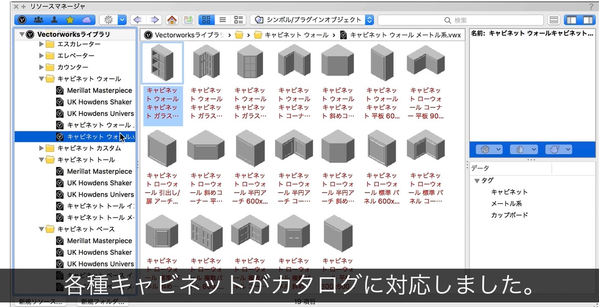 すべてのキャビネットを含むさらなる建築要素に、カタログスタイルのサポートを拡張しました。メーカーのカタログデータを選択することで、キャビネットの定義や設定を素早く行えます。カタログスタイルによるオブジェクトの調整はデータ編集を素早くし、オブジェクトの仕様にかかる時間を節約できます。