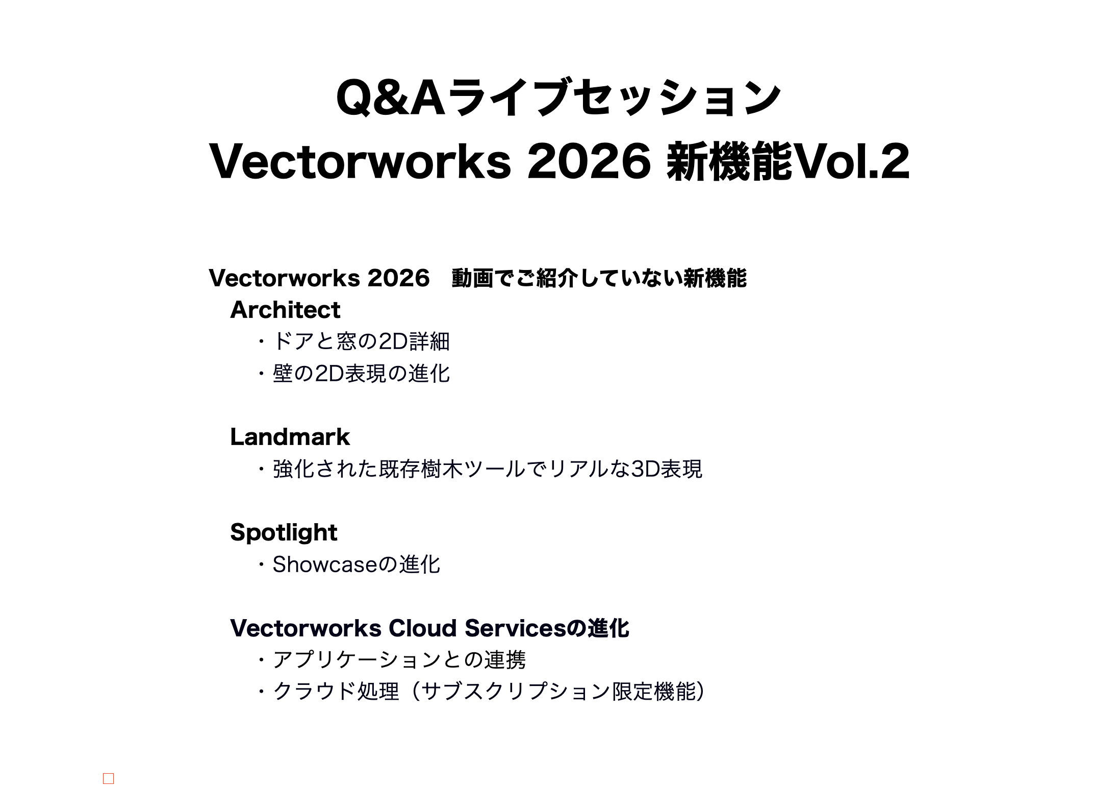 2026年3月開催「Q&Aライブセッション Vectorworks 2026 新機能Vol.2」の前半に行った、動画では紹介されていない2026の新機能のご紹介です。この回では、Architect、Landmark、Spotlightの製品で使える機能とCloud servicesの機能強化をご紹介しています。